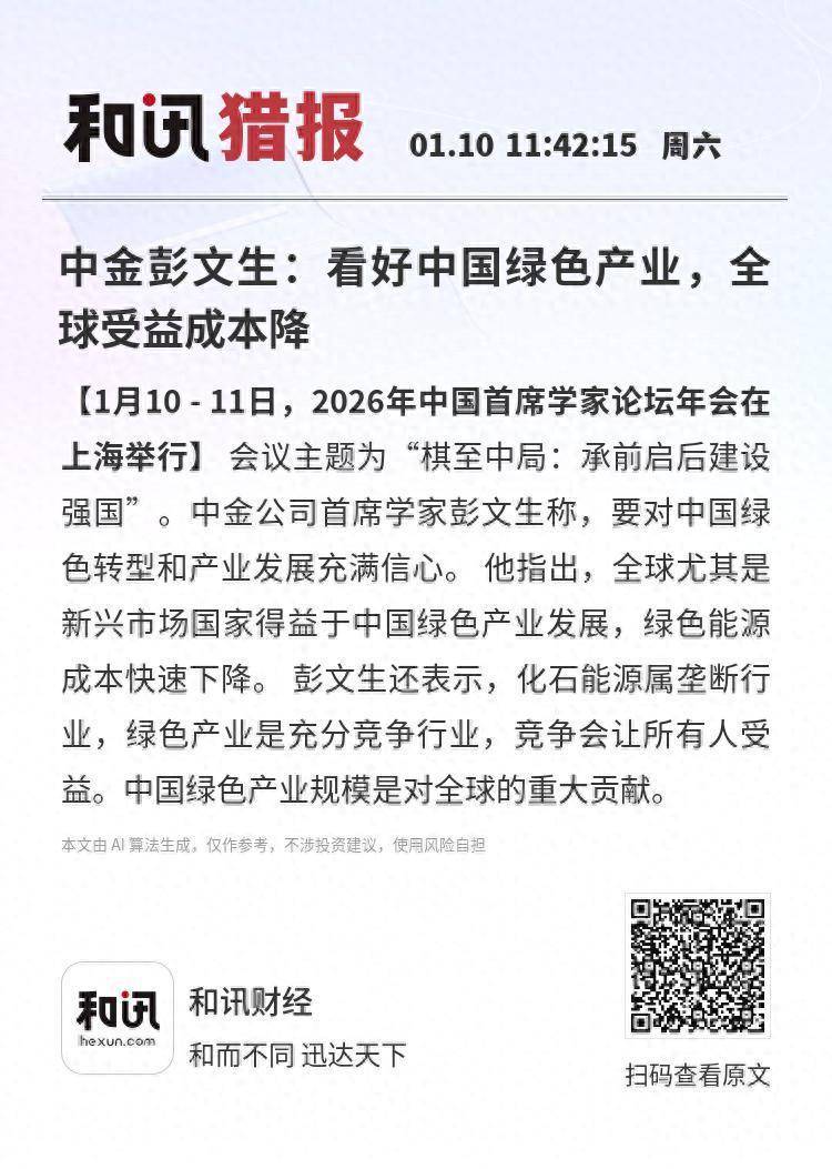 【1月10 - 11日,2026年中国首席学家论坛年会在上海举行】会议主题为“棋至中局:承前启后建设强国”。中金公司首席学家彭文生称,要对中国绿色转型和产业发展充满信心。 他指出牛牛配,全球尤其是新兴市场国家得益于中国绿色产业发展,绿色能源成本快速下降。 彭文生还表示,化石能源属垄断行业,绿色产业是充分竞争行业,竞争会让所有人受益。中国绿色产业规模是对全球的重大贡献。