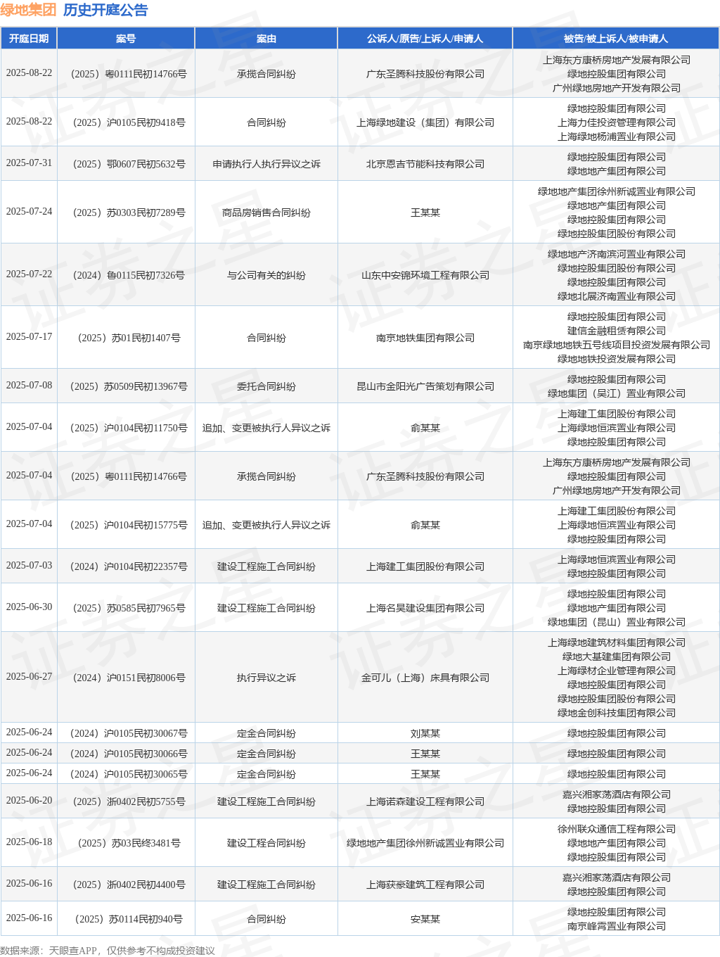 案号:(2025)浙0402民初5755号审理法院:嘉兴市南湖区人民法院案由:建设工程施工合同纠纷当事人信息: 原告/上诉人:上海诺森建设工程有限公司 被告/被上诉人:嘉兴湘家荡酒店有限公司、绿地控股集团有限公司开庭日期:2025年6月20日根据统计,近一年内以绿地控股集团有限公司为当事人的历史开庭公告有210则,其中案由为“建设工程施工合同纠纷”的公告以27则居首,其次为“金融借款合同纠纷”有26则,“合同纠纷”有22则。历史开庭公告(前20条)如下: