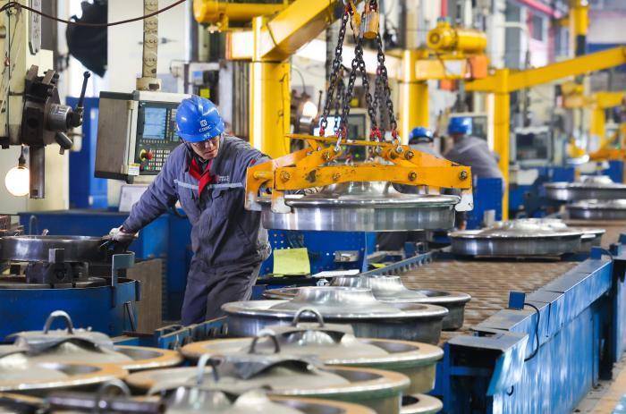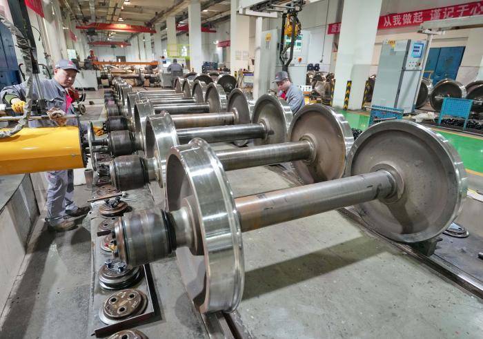 1月8日,工人在中车石家庄车辆有限公司生产火车轮对。新华社发(梁子栋 摄)
