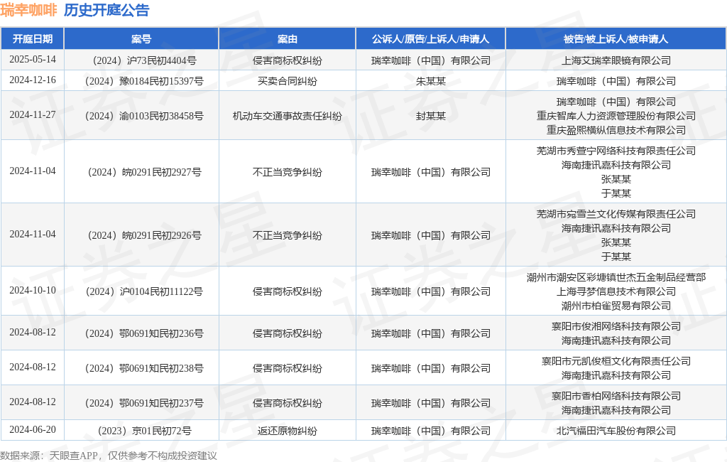 案号:(2024)沪73民初4404号审理法院:上海知识产权法院案由:侵害商标权纠纷当事人信息: 原告/上诉人:瑞幸咖啡(中国)有限公司 被告/被上诉人:上海艾瑞幸眼镜有限公司开庭日期:2025年5月14日根据统计,近一年内以瑞幸咖啡(中国)有限公司为当事人的历史开庭公告有10则,其中案由为“侵害商标权纠纷”的公告以5则居首,其次为“不正当竞争纠纷”有2则,“买卖合同纠纷”有1则。历史开庭公告如下:
